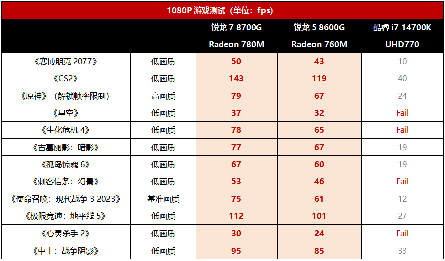 先来看看两款锐龙8000G处理器与14代酷睿i7 14700K的核显大战。这场对决完全是AMD全面碾压对手的形势,即便是锐龙5 8600G内置的Radeon 760M,和酷睿i7 14700K内置的UHD770相比也是不可企及的存在,在《使命召唤:现代战争3 2023》中的领先幅度甚至达到了408%……综合所有游戏来看,平均领先幅度达到了252%,锐龙7 8700G就更强了,平均领先酷睿i7 14700K的UHD770大约309%,最多领先525%。此外,我们还可以看到UHD770在运行《星空》《生化危机4》《刺客信条:幻景》《心灵杀手2》时出现了游戏崩溃或者不支持的情况,同时运行《使命召唤:现代战争3 2023》时也出现了花屏现象,可见在应对最新3A大作时UHD770已经严重力不从心了。考虑到目前Intel的第14代酷睿台式机处理器最高规格的核显就是UHD770,所以打算用核显玩游戏的朋友,显然锐龙8000G是目前最佳的选择。