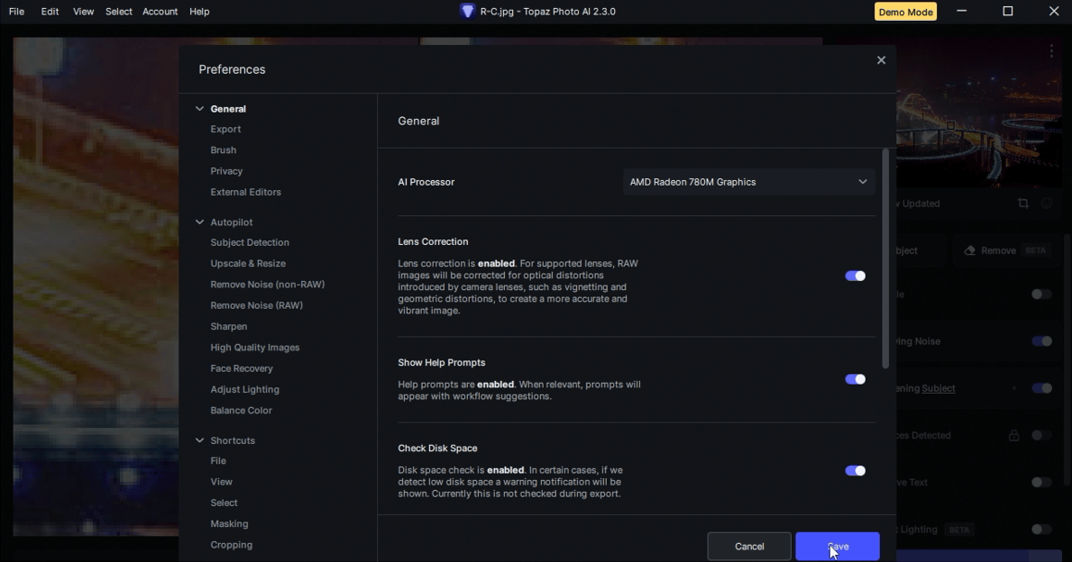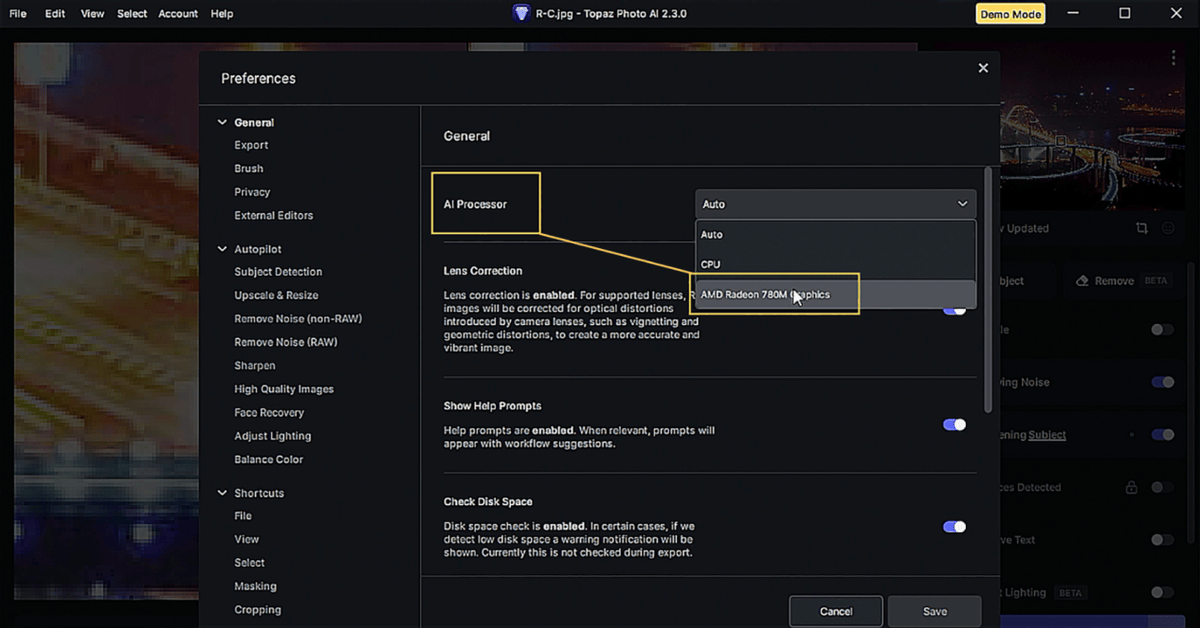 作为全能型AI处理器,锐龙8000G不光依靠Ryzen AI NPU来进行AI加速,其内置的RDNA3核显在AI加速性能方面也非常给力,并得到了众多AI应用软件的支持。如图所示,Topaz Photo AI就可以选择使用Radeon 780M核显来进行加速,实测用Radeon 780M的效率会比纯使用处理器更高。