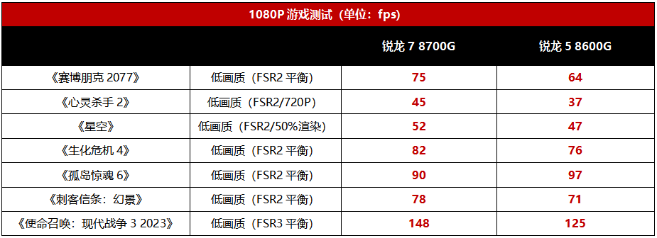 目前已经有大量的游戏加入了对FSR技术的支持,开启之后可以让游戏帧率大幅提升。从测试可以看到,在开启FSR之后,锐龙7 8700G在《赛博朋克2077》中竟然实现了75fps的平均帧率,锐龙5 8600G也达到了64fps,已经完全达到流畅的水准了。总的来看,除了《心灵杀手2》《星空》两个对显卡要求极高的游戏,两款锐龙8000G处理器在FSR加持下都可以让主流游戏大作达到平均60fps以上的流畅帧率,而这两个硬件杀手级游戏的帧率虽然不到60fps,但也基本达到了顺畅玩耍的程度,可见RDNA3核显真的非常强大。