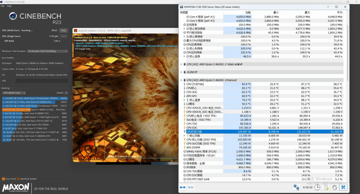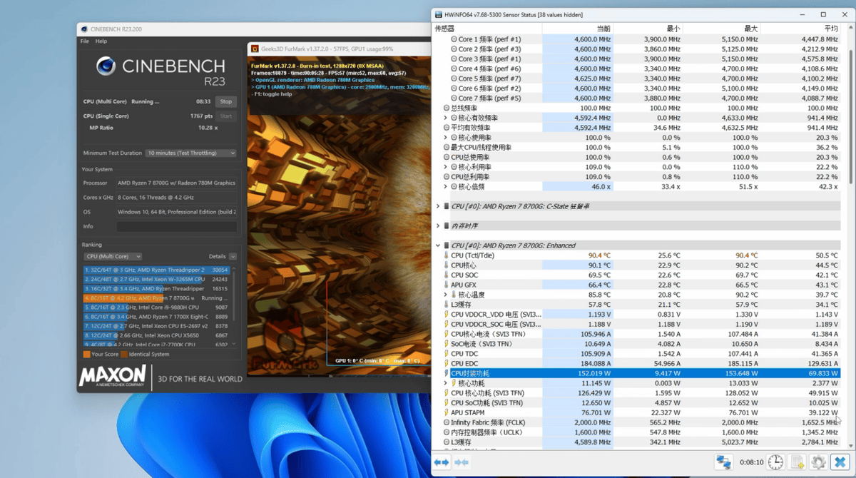功率输出方面,锐龙7 8700G可以说是相当强悍。单用FurMark对GPU考机,GPU功率最高可达65W,用Cinebench R23和FurMark对处理器与GPU进行双考机,则整颗处理器的输出功率可达153W左右,相比同为Phoenix核心的锐龙7040系列移动处理器,这个输出能力堪称起飞,性能高出许多也是理所当然了。温度方面,除了这种双考机的极限情况会达到温度墙之外,锐龙7 8700G玩游戏时的工作温度也只有50℃~60℃,搭载一个百元风冷散热器完全可以满足需求,组建ITX主机也是相当OK的。