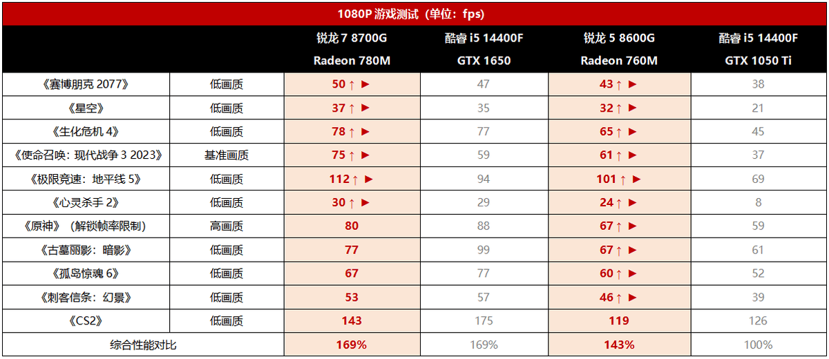 既然UHD770核显完全不是对手,那么我们不妨来看看锐龙8000G的RDNA3核显面对曾经的千元级经典独显又是个什么情况。锐龙7 8700G搭载了Radeon 780M核显,我们用GTX 1650 D6作为它的对手(搭载GDDR6显存的GTX 1650实际上比GDDR5版性能更强,是GTX 1650中定位最高的型号);锐龙5 8600G搭载了Radeon 760M,我们用GTX 1050 Ti作为它的对手,独显平台统一使用最新上市的酷睿i5 14400F处理器。