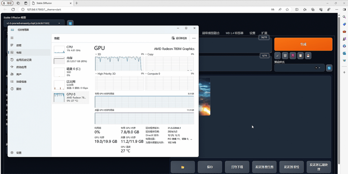 我们使用SD1.5模型进行出图测试,迭代步数为20、CFG为7、每批出图与批数皆为1,采样方式为Euler a,分辨率分别为512×512、768×768。可以看到,在512×512分辨率下,Radeon 780M大约每分钟出图1.38张,768×768分辨率下每分钟出图大约0.43张。这个速度其实已经是当前旗舰处理器出图速度的5倍~6倍了。最重要的是,由于显存可以分配得很大,Radeon 780M对高分辨率出图的支持度甚至好于一些只有4GB~6GB显存的独立显卡。