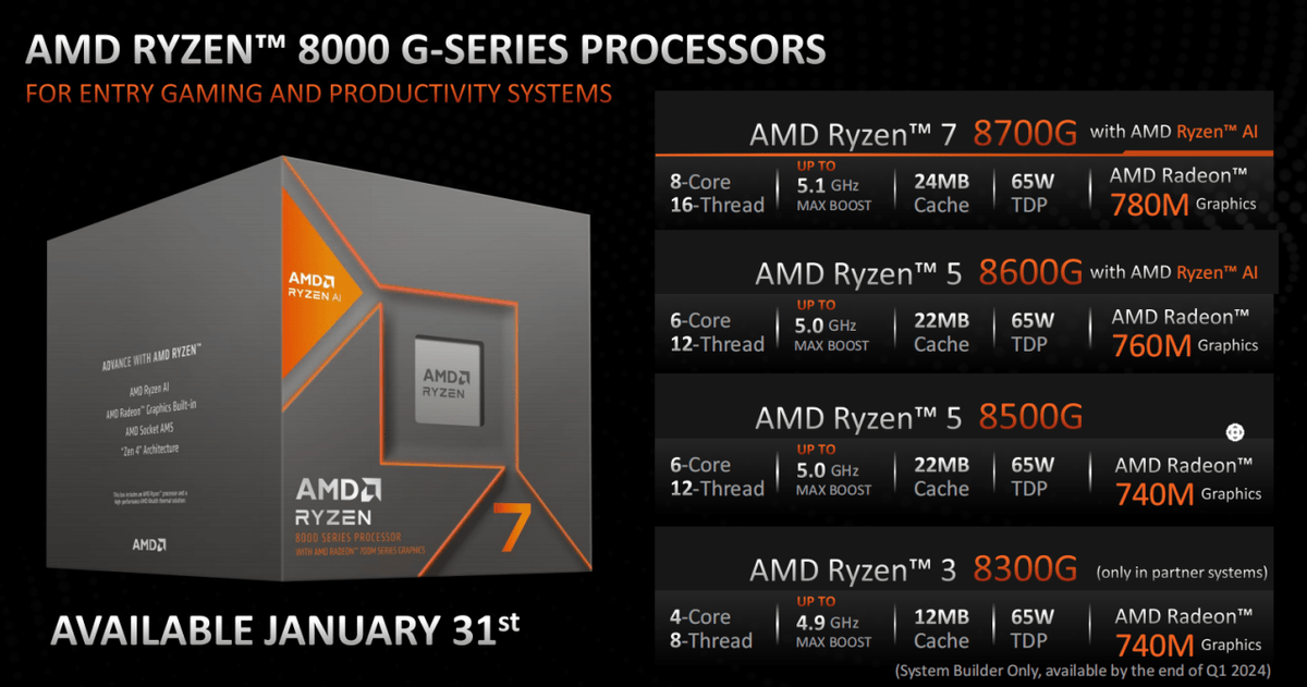 目前发布的锐龙8000G系列包含了四款型号,都是AM5接口、65W TDP。最高端的是锐龙7 8700G,拥有8核16线MB三级缓存,内置Radeon 780M(12CU)核显,首发秒杀价2499元。次旗舰是锐龙5 8600G,拥有6核12线MB三级缓存,内置Radeon 760M(8CU)核显,首发秒杀价1699元。接下来是锐龙5 8500G,也是6核12线程规格,最高加速频率也是5GHz,核显为Radeon 740M(4CU)。最后是锐龙3 8300G,4核8线MB三级缓存,核显也是Radeon 740M(4CU)。这四款型号中,锐龙3 8300G专供系统集成商,将在2024年第一季度末上市,而其他三款将在1月31日正式开售。