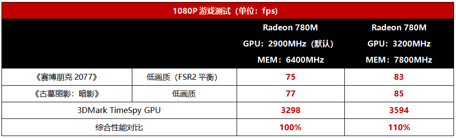 锐龙8000G内置的Radeon 700M支持超频,同时对内存超频也可以大幅提升它的显存带宽,从而带来游戏性能提升。经过简单的尝试,我们把锐龙7 8700G内置的Radeon 780M超到了3200MHz,同时内存频率也提升到了DDR5 7800。从测试来看,超频状态下的Radeon 780M游戏性能进一步提升了10%左右,《赛博朋克2077》的平均帧率也达到了惊人的83fps,这也是首款能让《赛博朋克2077》在1080P分辨率下达到平均80fps以上的核显,堪称核显发展史上的里程碑。