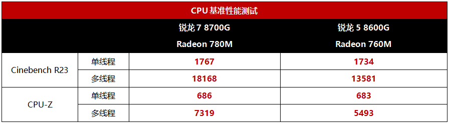 处理器基准性能部分,虽说锐龙8000G和锐龙7040系列核心同源,但得益于功率限制更加宽泛,因此基准性能分数还是要高出不少的。锐龙7 8700G作为一款8核16线程的主流处理器,从Cinebench R23的得分也可以看出它除了游戏之外也完全可以胜任日常生产力应用的需求。锐龙5 8600G则达到了甜品级6核12线程处理器的高水准,作为主流装机U来讲性价比也非常出色。