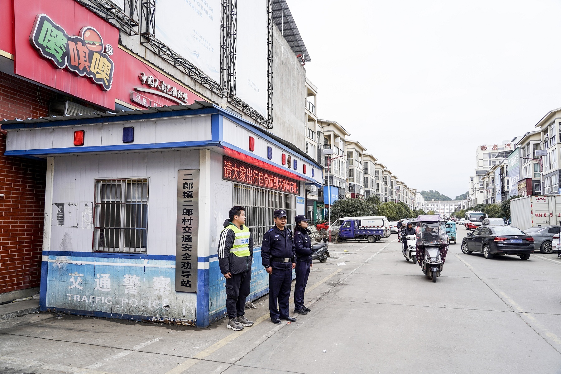 2025年年初,在属地党委、政府支持下,二郎派出所精准锚定治理痛点,创新构建“三员”联动勤务模式:以社区民警为核心牵头统筹,整合社区治保主任、包片干部组成的网格员队伍,同步聘请2名责任心强、熟悉路况的本地群众担任专职交通劝导员,明确三者“分工不分家、协同补短板”的工作机制。为强化交通治理支撑,该所联合交警部门在二郎街核心路口设立交通安全劝导站,在人民路等易拥堵路段安装4个违停抓拍摄像头,形成“科技赋能+人工值守”的交通管控体系,让“三员”联动有了坚实载体。